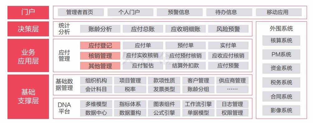 应付管理系统实现企业应付业务流程的集中管理,规范应付账款活动,记录采购类合同执行过程中的结算、发票确认与付款等业务。以采购合同为主线,以合同结算为依据,严控超合同结算、超合同付款、超发票付款等行为,把项目管理过程中的“三超两无”在系统中进行落地管控。应付管理系统全面、及时、准确地反映企业的应付账款信息,出具应付账款各类统计报表,为企业领导决策提供辅助信息。